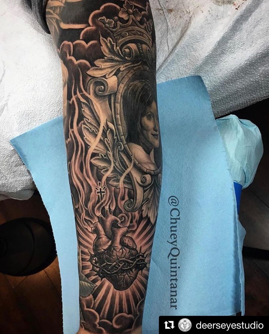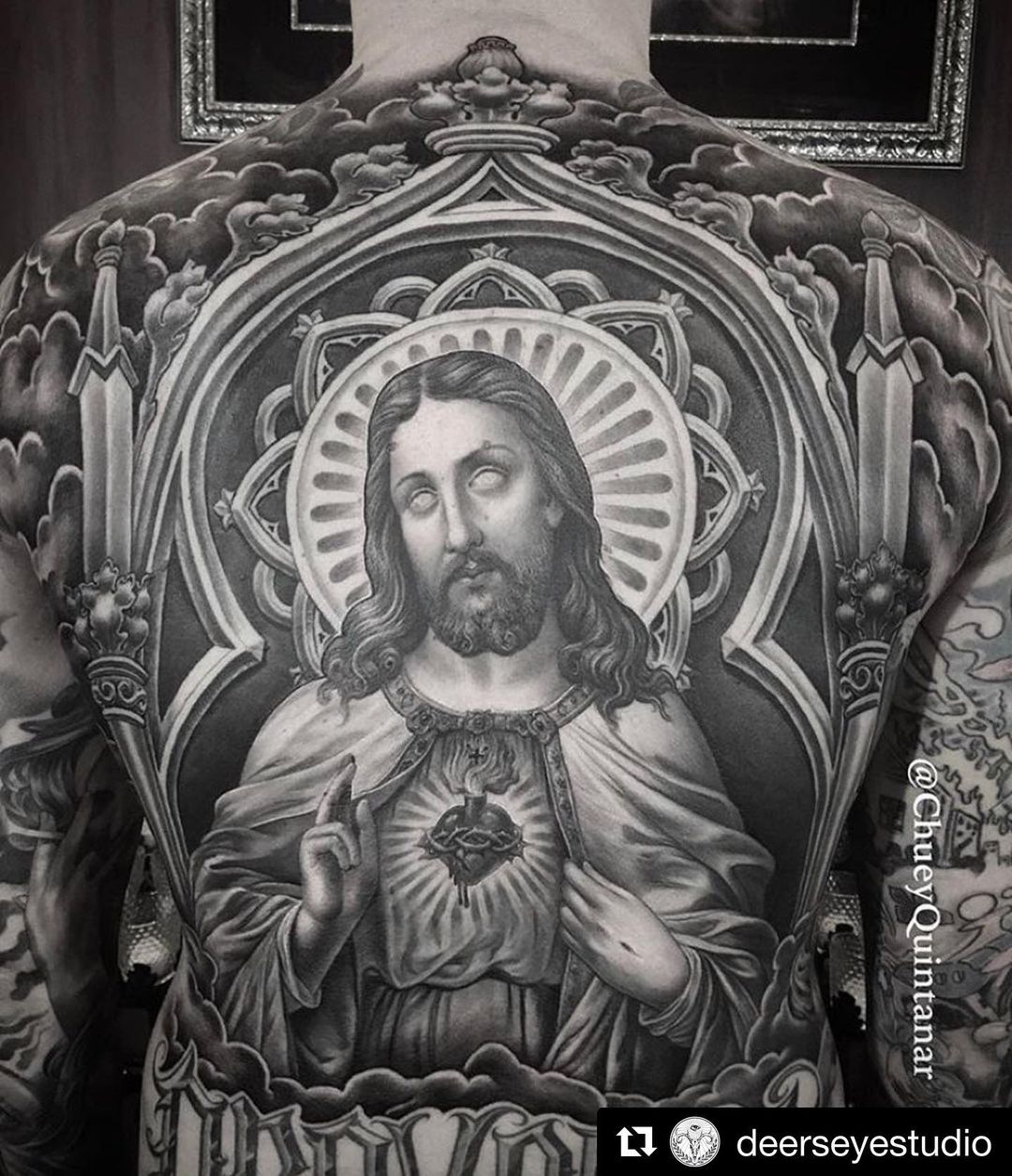 Latino tattoo artist Chuey Quintanar has been working alongside Jack Rudy at the legendary Goodtime Charlie’s Tattooland in Anaheim, CA for the past several years, and is among the greatest of his genre. Quintanar, who taught himself to tattoo with a homemade rotary machine, is largely influenced by Catholic imagery, a mirror of his Latin roots, which originated from Mexico City and has transplanted into the streets and ghettos of South LA.
