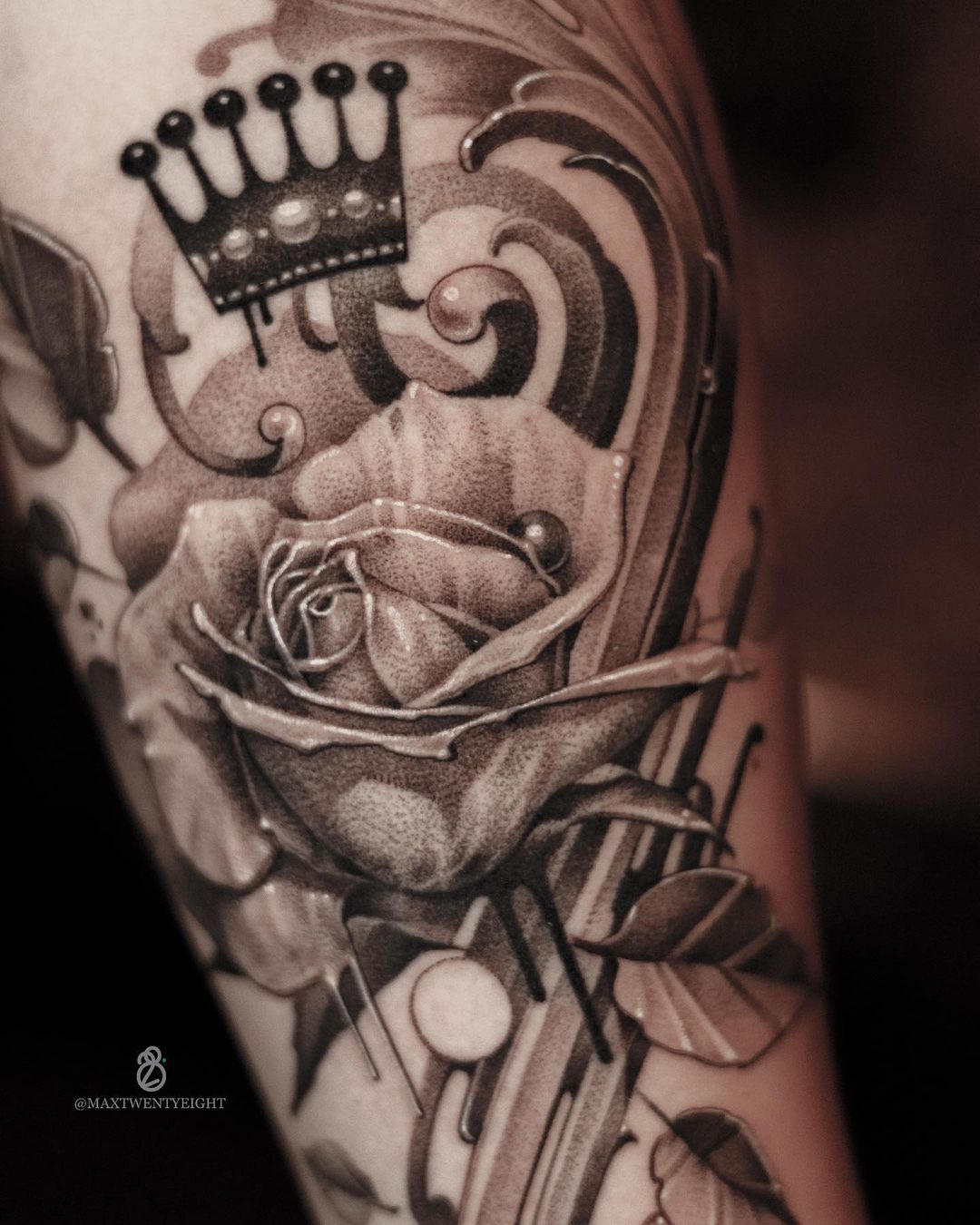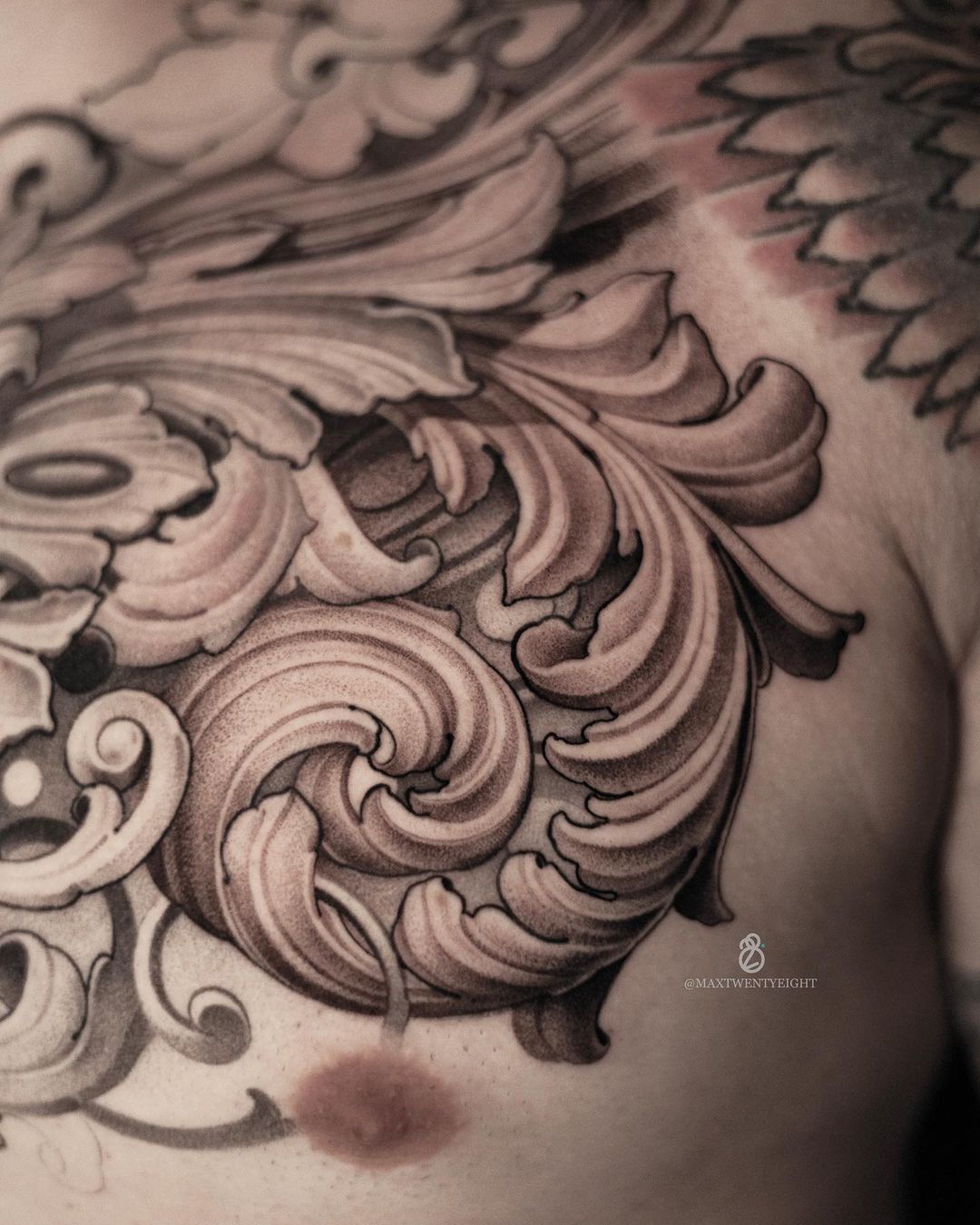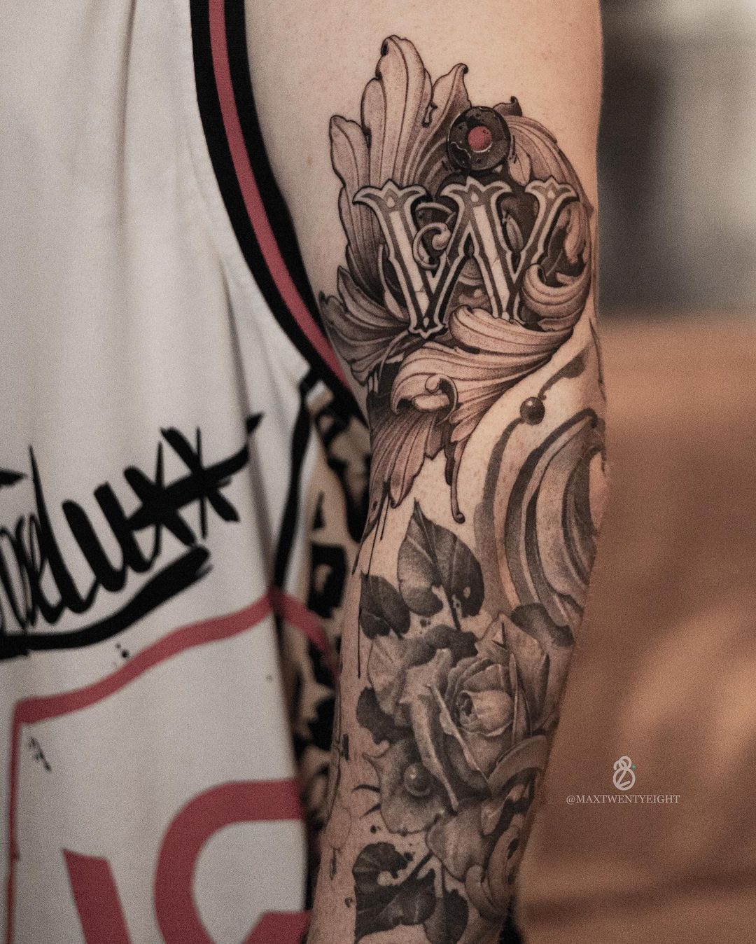 Maksim Twenty Eight is a professional tattoo artist with over a decade of experience in the tattoo industry. He has achieved recognition as both a participant and a winner in numerous international tattoo conventions. Maksim's expertise lies primarily in black and gray tattoos, though he occasionally incorporates color into his designs. His specialization is in creating Baroque floral ornaments and stylizing various realistic objects. He is known for his incredible passion for details, which often hold special meanings either for his clients or himself, adding a unique touch to each piece.In his tattooing career, Maksim has chosen the path of an artist. For him, simply applying tattoos is not fulfilling; his primary goal is to develop as an artist and to craft new and exclusive designs for each of his clients.