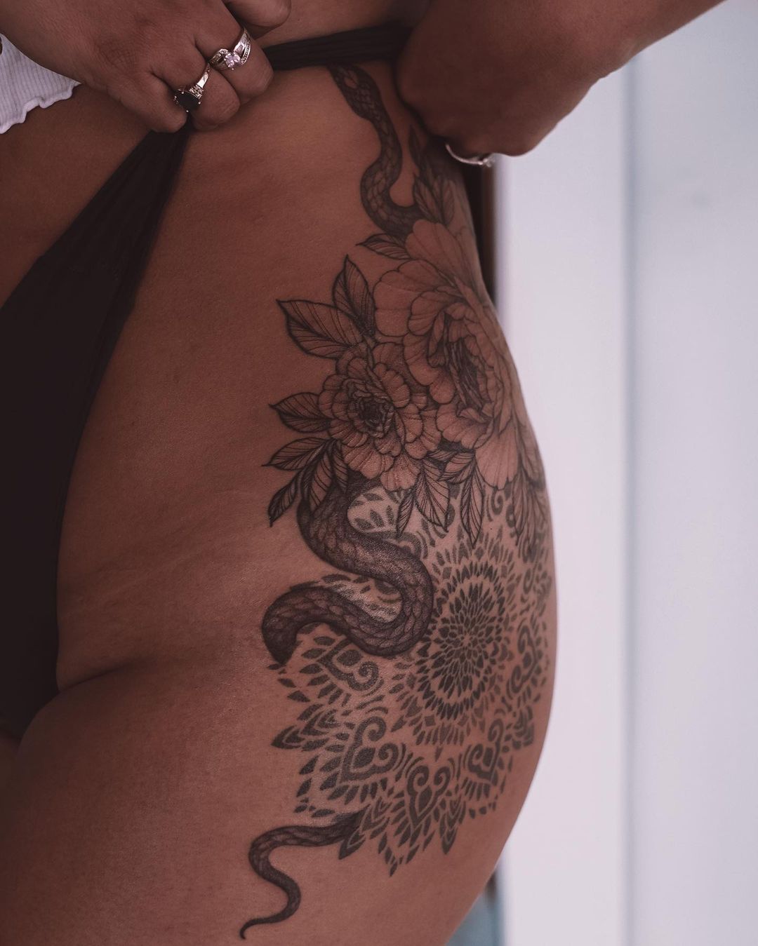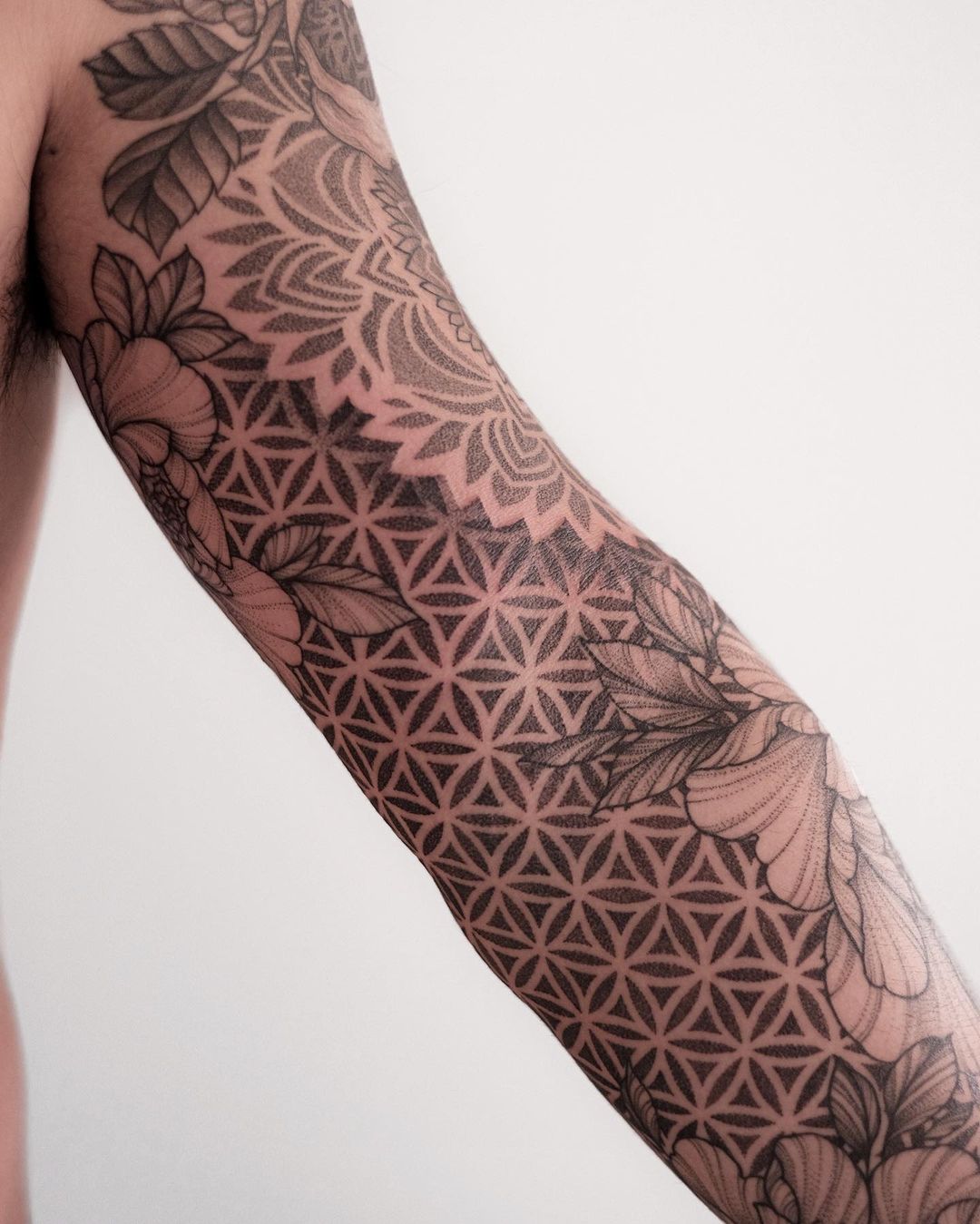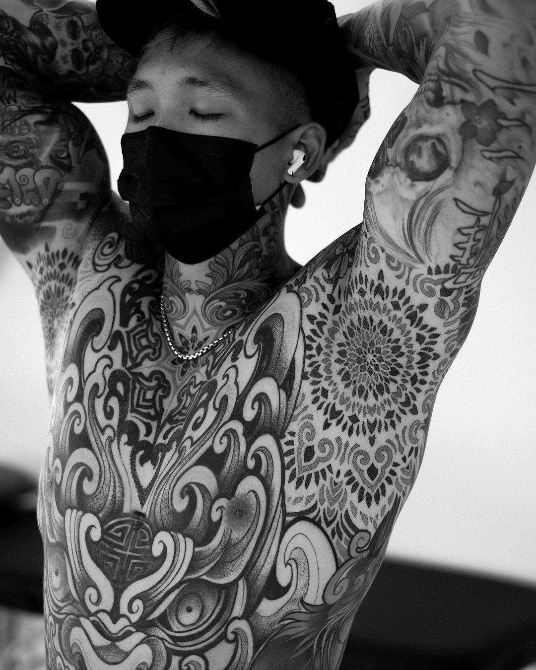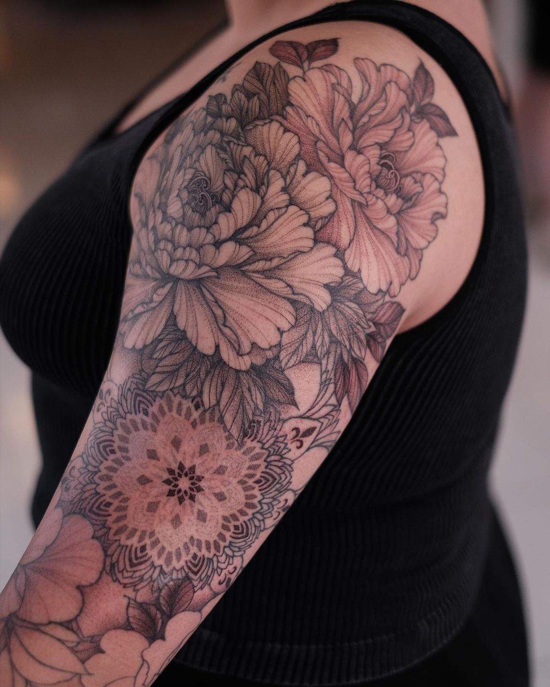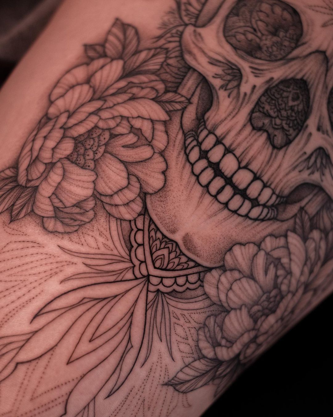 Sasha Masiuk is known for her intricate grey-scale style of tattooing that incorporates line work and dots to add volume to the image as it appears on the skin. Her personal approach for each client is apparent in her work - she creates an individual sketch for each client which makes it look authentic. She focuses on delicate floral patterns that lend to the form she specializes in.
