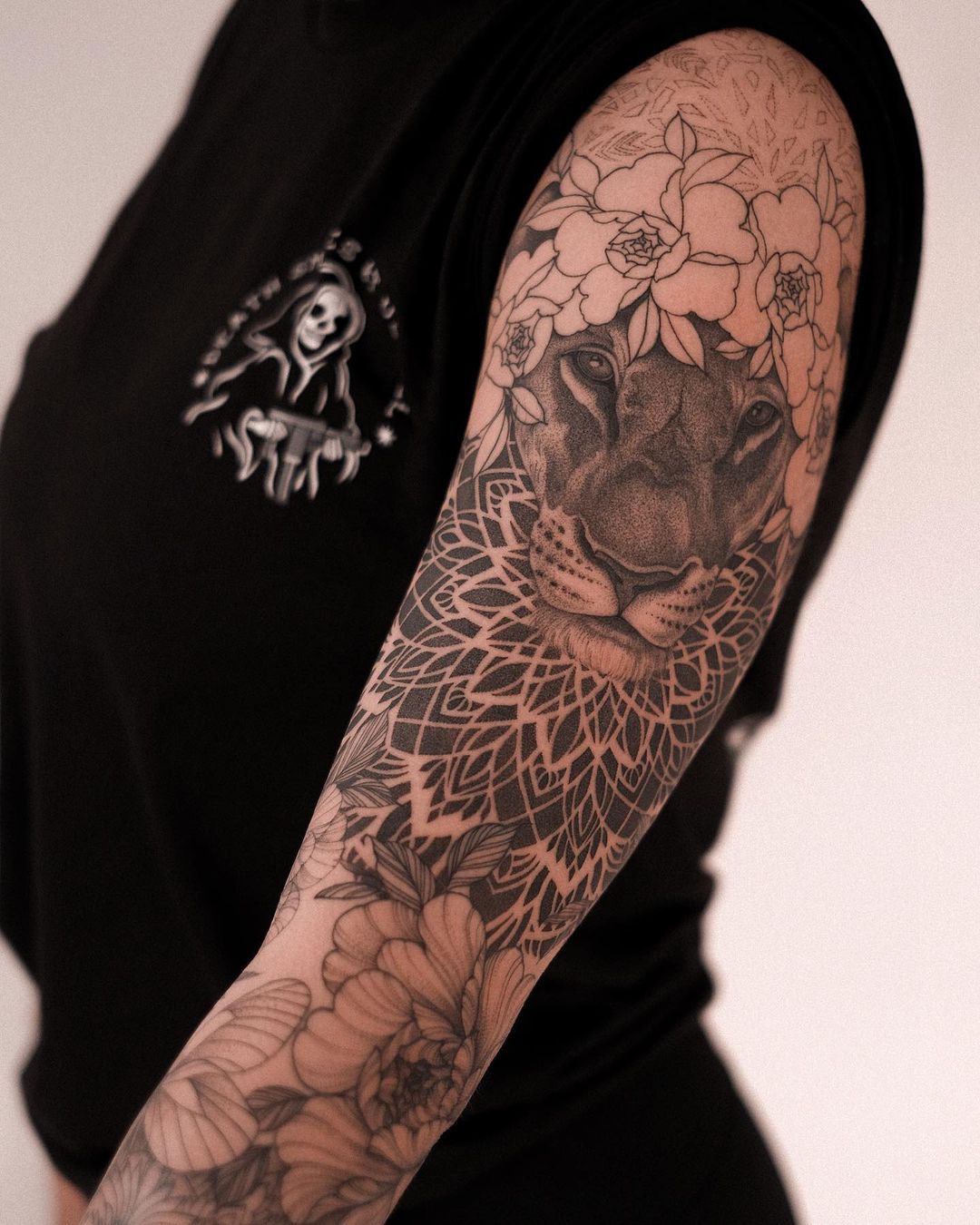 Sasha Masiuk is known for her intricate grey-scale style of tattooing that incorporates line work and dots to add volume to the image as it appears on the skin. Her personal approach for each client is apparent in her work - s...